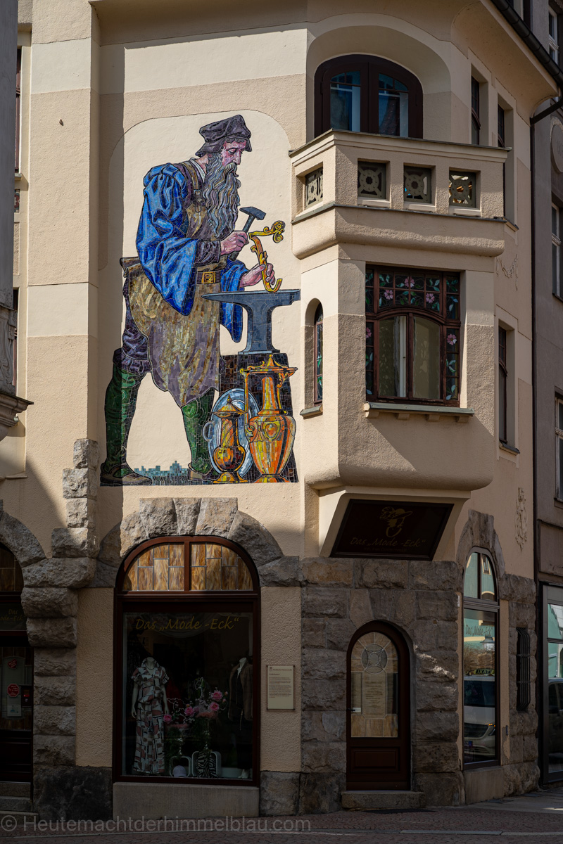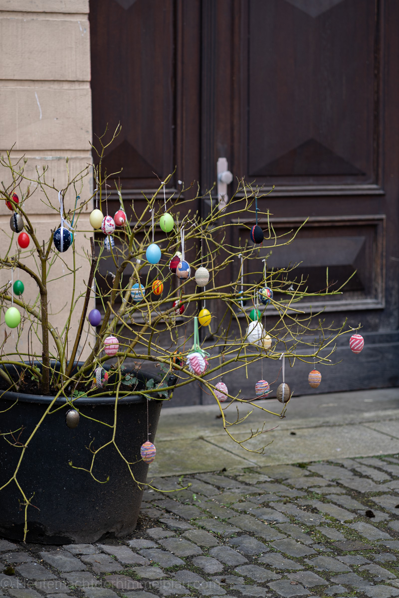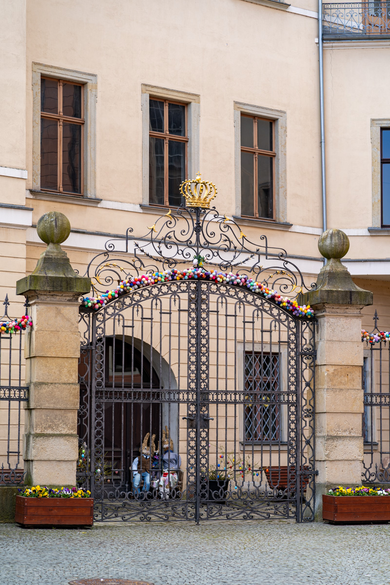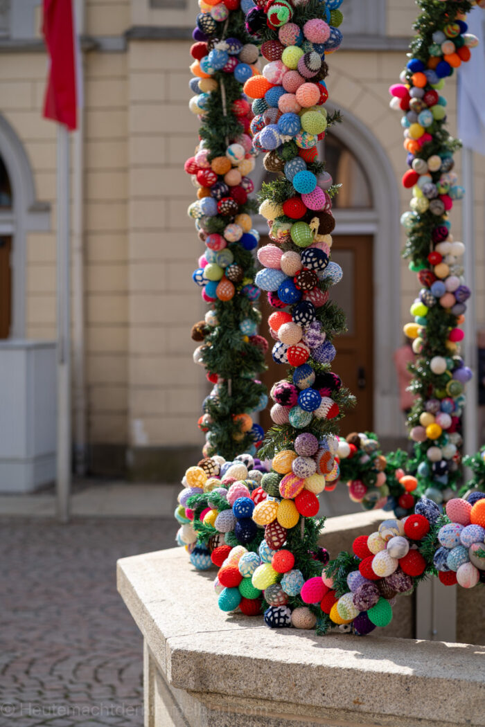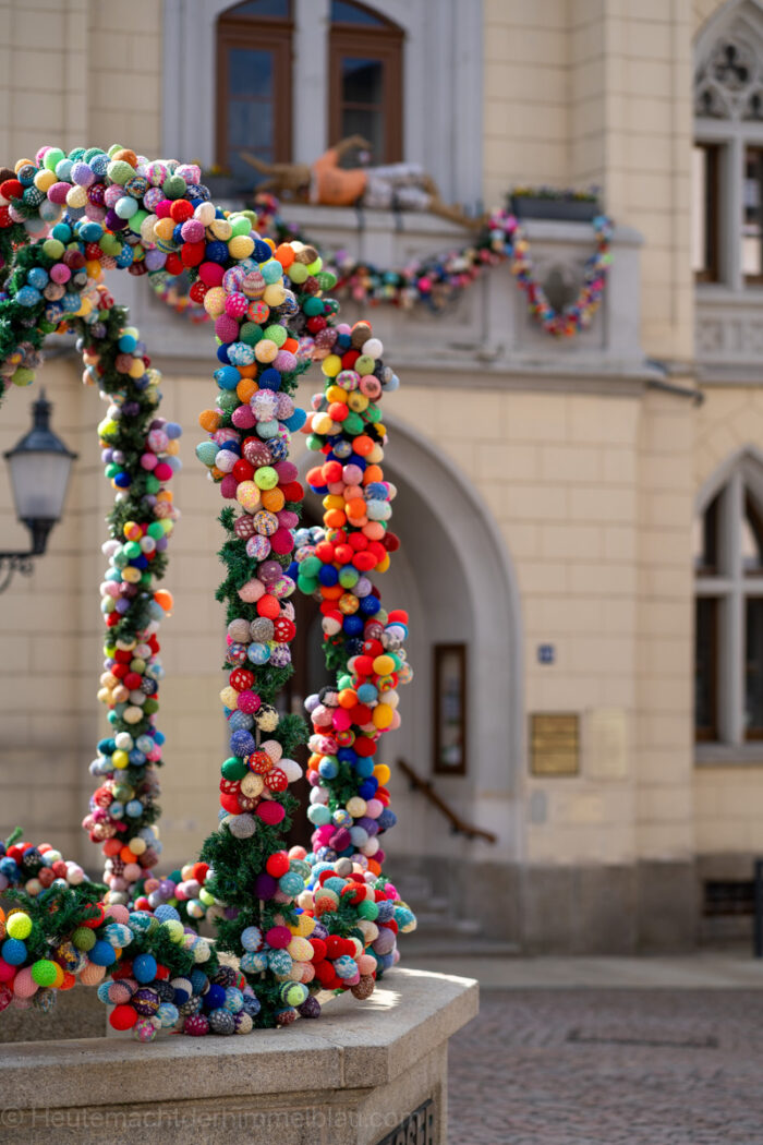 Da wir in der Osterzeit unterwegs waren, war die Stadt liebevoll österlich geschmückt. Ursprünglich aus der Fränkischen Schweiz stammend, hat sich der Brauch, in der Zeit vor Ostern öffentliche Dorfbrunnen mit bemalten Ostereiern und anderen Verzierungen als Osterbrunnen zu schmücken, seit den 1980er Jahren auch in weiten Teilen Süd-, Mittel- und Ostdeutschlands verbreite, so auch in Greiz.