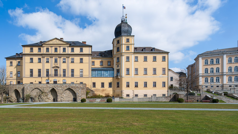 Das Untere Schloss liegt direkt am Ufer der Weißen Elster neben der Stadtkirche St. Marien und damit nur wenige Schritte von der Innenstadt entfernt.